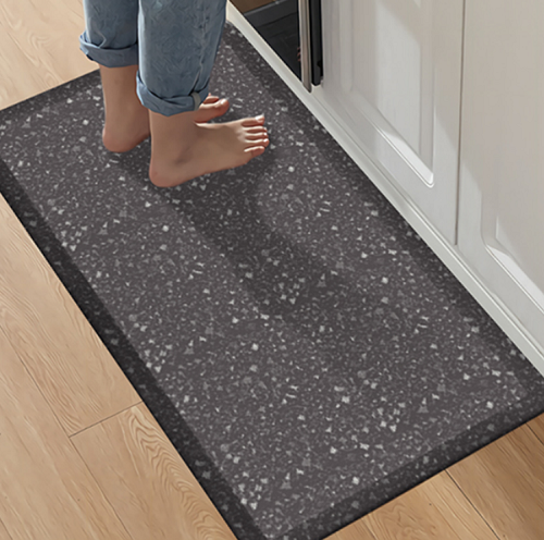 - The top of the anti-fatigue gel mat is designed with an attractive texture while the bottom is made of a non-slip material. The memory foam kitchen floor mat may be used on multiple surfaces (tile, wood, ceramic, marble, etc).
